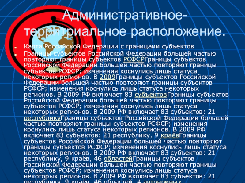 частью повторяют границы субъектов РСФСРГраницы субъектов Российской Федерации большей частью повторяют границы субъектов РСФСР; изменения коснулись лишь статуса некоторых регионов. В 2009Границы субъектов Российской Федерации большей частью повторяют границы субъектов РСФСР; изменения коснулись лишь статуса некоторых регионов. В 2009 РФ включает 83 субъектовГраницы субъектов Российской Федерации большей частью повторяют границы субъектов РСФСР; изменения коснулись лишь статуса некоторых регионов. В 2009 РФ включает 83 субъектов: 21 республикуГраницы субъектов Российской Федерации большей частью повторяют границы субъектов РСФСР; изменения коснулись лишь статуса некоторых регионов. В 2009 РФ включает 83 субъектов: 21 республику, 9 краёвГраницы субъектов Российской Федерации большей частью повторяют границы субъектов РСФСР; изменения коснулись лишь статуса некоторых регионов. В 2009 РФ включает 83 субъектов: 21 республику, 9 краёв, 46 областейГраницы субъектов Российской Федерации большей частью повторяют границы субъектов РСФСР; изменения коснулись лишь статуса некоторых регионов. В 2009 РФ включает 83 субъектов: 21 республику, 9 краёв, 46 областей, 4 автономных округовГраницы субъектов Российской Федерации большей частью повторяют границы субъектов РСФСР; изменения коснулись лишь статуса некоторых регионов. В 2009 РФ включает 83 субъектов: 21 республику, 9 краёв, 46 областей, 4 автономных округов и 1 автономную областьГраницы субъектов Российской Федерации большей частью повторяют границы субъектов РСФСР; изменения коснулись лишь статуса некоторых регионов. В 2009 РФ включает 83 субъектов: 21 республику, 9 краёв, 46 областей, 4 автономных округов и 1 автономную область; МоскваГраницы субъектов Российской Федерации большей частью повторяют границы субъектов РСФСР; изменения коснулись лишь статуса некоторых регионов. В 2009 РФ включает 83 субъектов: 21 республику, 9 краёв, 46 областей, 4 автономных округов и 1 автономную область; Москва и Санкт-ПетербургГраницы субъектов Российской Федерации большей частью повторяют границы субъектов РСФСР; изменения коснулись лишь статуса некоторых регионов. В 2009 РФ включает 83 субъектов: 21 республику, 9 краёв, 46 областей, 4 автономных округов и 1 автономную область; Москва и Санкт-Петербург являются городами федерального значения — отдельными субъектами Российской Федерации. В 2000Границы субъектов Российской Федерации большей частью повторяют границы субъектов РСФСР; изменения коснулись лишь статуса некоторых регионов. В 2009 РФ включает 83 субъектов: 21 республику, 9 краёв, 46 областей, 4 автономных округов и 1 автономную область; Москва и Санкт-Петербург являются городами федерального значения — отдельными субъектами Российской Федерации. В 2000 территория РФ была разделена на 7 федеральных округов — ЦентральныйГраницы субъектов Российской Федерации большей частью повторяют границы субъектов РСФСР; изменения коснулись лишь статуса некоторых регионов. В 2009 РФ включает 83 субъектов: 21 республику, 9 краёв, 46 областей, 4 автономных округов и 1 автономную область; Москва и Санкт-Петербург являются городами федерального значения — отдельными субъектами Российской Федерации. В 2000 территория РФ была разделена на 7 федеральных округов — Центральный, Северо-ЗападныйГраницы субъектов Российской Федерации большей частью 