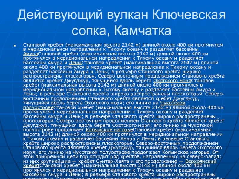 длиной около 400 км протянулся в меридиональном направлении к Тихому океану и разделяет бассейны АмураСтановой хребет (максимальная высота 2142 м) длиной около 400 км протянулся в меридиональном направлении к Тихому океану и разделяет бассейны Амура и ЛеныСтановой хребет (максимальная высота 2142 м) длиной около 400 км протянулся в меридиональном направлении к Тихому океану и разделяет бассейны Амура и Лены; в рельефе Станового хребта широко распространены плоскогорья. Северо-восточным продолжением Станового хребта является хребет Джугджур, тянущийся вдоль берега Охотского моряСтановой хребет (максимальная высота 2142 м) длиной около 400 км протянулся в меридиональном направлении к Тихому океану и разделяет бассейны Амура и Лены; в рельефе Станового хребта широко распространены плоскогорья. Северо-восточным продолжением Станового хребта является хребет Джугджур, тянущийся вдоль берега Охотского моря; его линию на Чукотском полуостровеСтановой хребет (максимальная высота 2142 м) длиной около 400 км протянулся в меридиональном направлении к Тихому океану и разделяет бассейны Амура и Лены; в рельефе Станового хребта широко распространены плоскогорья. Северо-восточным продолжением Станового хребта является хребет Джугджур, тянущийся вдоль берега Охотского моря; его линию на Чукотском полуострове продолжает Колымское нагорьеСтановой хребет (максимальная высота 2142 м) длиной около 400 км протянулся в меридиональном направлении к Тихому океану и разделяет бассейны Амура и Лены; в рельефе Станового хребта широко распространены плоскогорья. Северо-восточным продолжением Станового хребта является хребет Джугджур, тянущийся вдоль берега Охотского моря; его линию на Чукотском полуострове продолжает Колымское нагорье. От этой прибрежной цепи гор отходит ряд хребтов, направленных на северо-запад; из них крупнейшие — хребет Сунтар-Хаята и его продолжение — Верхоянский хребетСтановой хребет (максимальная высота 2142 м) длиной около 400 км протянулся в меридиональном направлении к Тихому океану и разделяет бассейны Амура и Лены; в рельефе Станового хребта широко распространены плоскогорья. Северо-восточным продолжением Станового хребта является хребет Джугджур, тянущийся вдоль берега Охотского моря; его линию на Чукотском полуострове продолжает Колымское нагорье. От этой прибрежной цепи гор отходит ряд хребтов, направленных на северо-запад; из них крупнейшие — хребет Сунтар-Хаята и его продолжение — Верхоянский хребет (высшая точка — 2389 м), идущий вдоль нижнего течения Лены; хребет ЧерскогоСтановой хребет (максимальная высота 2142 м) длиной около 400 км протянулся в меридиональном направлении к Тихому океану и разделяет бассейны Амура и Лены; в рельефе Станового хребта широко распространены плоскогорья. Северо-восточным продолжением Станового хребта является хребет Джугджур, тянущийся вдоль берега Охотского моря; его линию на Чукотском полуострове продолжает Колымское нагорье. От этой прибрежной цепи гор отходит ряд хребтов, направленных на северо-запад; из них крупнейшие — хребет Сунтар-Хаята и его продолжение — Верхоянский хребет (высшая точка — 2389 м), идущий вдоль нижнего течения Лены; хребет Черского (высота до 3147 м, гора ПобедаСтановой хребет (максимальная высота 2142 м) длиной около 400 км протянулся в меридиональном направлен