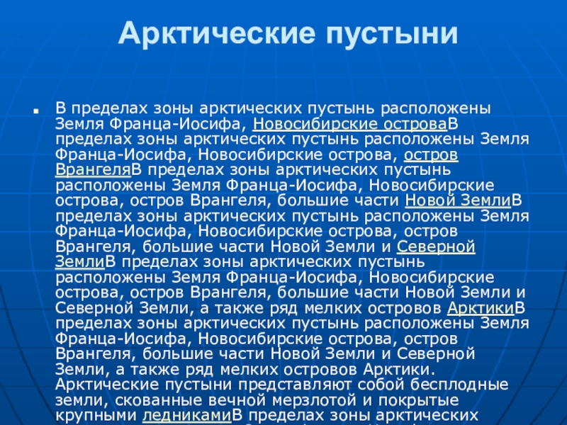 пределах зоны арктических пустынь расположены Земля Франца-Иосифа, Новосибирские острова, остров ВрангеляВ пределах зоны арктических пустынь расположены Земля Франца-Иосифа, Новосибирские острова, остров Врангеля, большие части Новой ЗемлиВ пределах зоны арктических пустынь расположены Земля Франца-Иосифа, Новосибирские острова, остров Врангеля, большие части Новой Земли и Северной ЗемлиВ пределах зоны арктических пустынь расположены Земля Франца-Иосифа, Новосибирские острова, остров Врангеля, большие части Новой Земли и Северной Земли, а также ряд мелких островов АрктикиВ пределах зоны арктических пустынь расположены Земля Франца-Иосифа, Новосибирские острова, остров Врангеля, большие части Новой Земли и Северной Земли, а также ряд мелких островов Арктики. Арктические пустыни представляют собой бесплодные земли, скованные вечной мерзлотой и покрытые крупными ледникамиВ пределах зоны арктических пустынь расположены Земля Франца-Иосифа, Новосибирские острова, остров Врангеля, большие части Новой Земли и Северной Земли, а также ряд мелких островов Арктики. Арктические пустыни представляют собой бесплодные земли, скованные вечной мерзлотой и покрытые крупными ледниками (общая площадь покровного оледенения — более 55 тыс. км²). Почвы очень бедны гумусомВ пределах зоны арктических пустынь расположены Земля Франца-Иосифа, Новосибирские острова, остров Врангеля, большие части Новой Земли и Северной Земли, а также ряд мелких островов Арктики. Арктические пустыни представляют собой бесплодные земли, скованные вечной мерзлотой и покрытые крупными ледниками (общая площадь покровного оледенения — более 55 тыс. км²). Почвы очень бедны гумусом. Растительность почти отсутствует и представлена преимущественно лишайникамиВ пределах зоны арктических пустынь расположены Земля Франца-Иосифа, Новосибирские острова, остров Врангеля, большие части Новой Земли и Северной Земли, а также ряд мелких островов Арктики. Арктические пустыни представляют собой бесплодные земли, скованные вечной мерзлотой и покрытые крупными ледниками (общая площадь покровного оледенения — более 55 тыс. км²). Почвы очень бедны гумусом. Растительность почти отсутствует и представлена преимущественно лишайниками. Животный мир также крайне беден — там живут белые медведиВ пределах зоны арктических пустынь расположены Земля Франца-Иосифа, Новосибирские острова, остров Врангеля, большие части Новой Земли и Северной Земли, а также ряд мелких островов Арктики. Арктические пустыни представляют собой бесплодные земли, скованные вечной мерзлотой и покрытые крупными ледниками (общая площадь покровного оледенения — более 55 тыс. км²). Почвы очень бедны гумусом. Растительность почти отсутствует и представлена преимущественно лишайниками. Животный мир также крайне беден — там живут белые медведи, белухиВ пределах зоны арктических пустынь расположены Земля Франца-Иосифа, Новосибирские острова, остров Врангеля, большие части Новой Земли и Северной Земли, а также ряд мелких островов Арктики. Арктические пустыни представляют собой бесплодные земли, скованные вечной мерзлотой и покрытые крупными ледниками (общая площадь покровного оледенения — более 55 тыс. км²). Почвы очень бедны гумусом. Растительность почти отсутствует и представлена преимущественно л