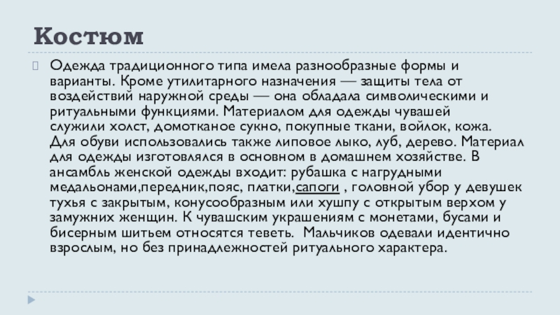 тела от воздействий наружной среды — она обладала символическими и ритуальными функциями. Материалом для одежды чувашей служили холст, домотканое сукно, покупные ткани, войлок, кожа. Для обуви использовались также липовое лыко, луб, дерево. Материал для одежды изготовлялся в основном в домашнем хозяйстве. В ансамбль женской одежды входит: рубашка с нагрудными медальонами,передник,пояс, платки,сапоги , головной убор у девушек тухья с закрытым, конусообразным или хушпу с открытым верхом у замужних женщин. К чувашским украшениям с монетами, бусами и бисерным шитьем относятся теветь. Мальчиков одевали идентично взрослым, но без принадлежностей ритуального характера.