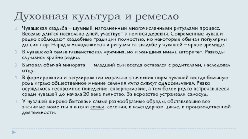В чувашской семье главенствовал мужчина, но и женщина имела авторитет. Разводы случались крайне редко.