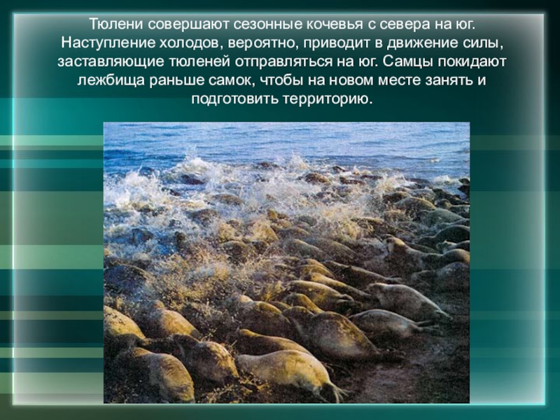 Слайд 17Тюлени совершают сезонные кочевья с севера на юг.