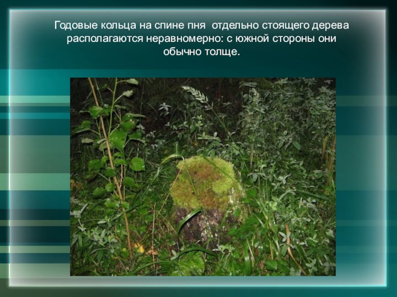 Слайд 19Годовые кольца на спине пня отдельно стоящего дерева располагаются неравномерно: с
