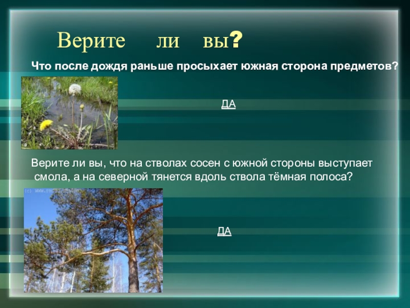 Верите ли вы, что на стволах сосен с южной стороны выступает