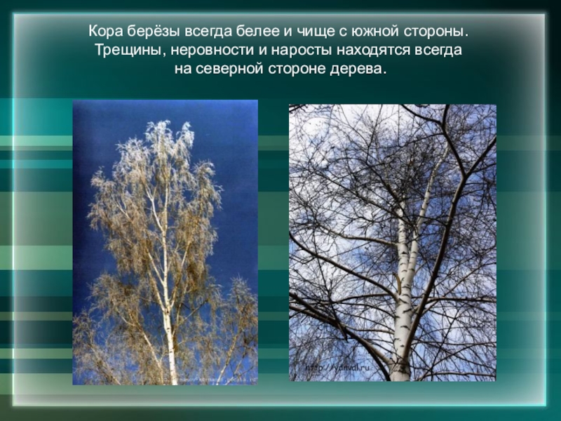 Слайд 3Кора берёзы всегда белее и чище с южной стороны.