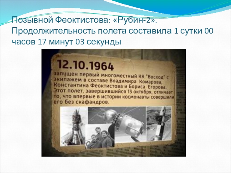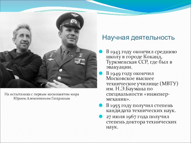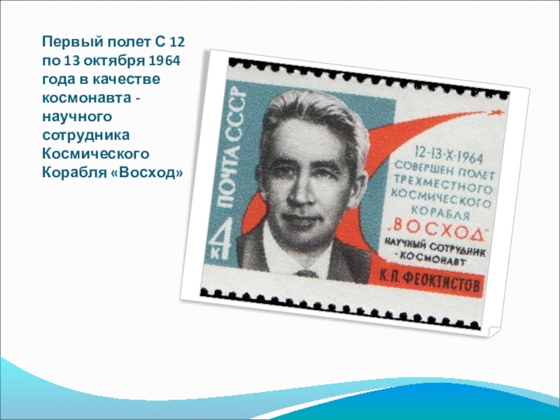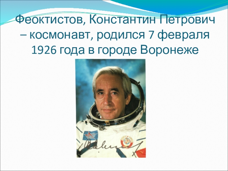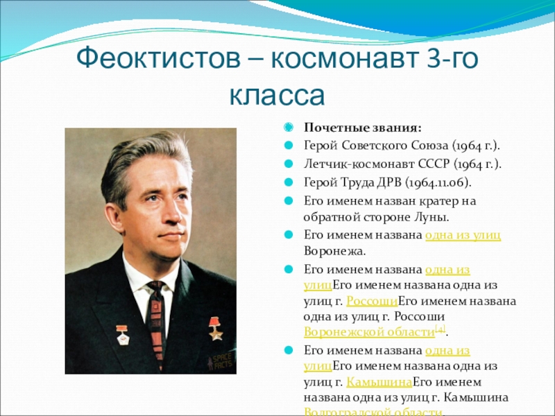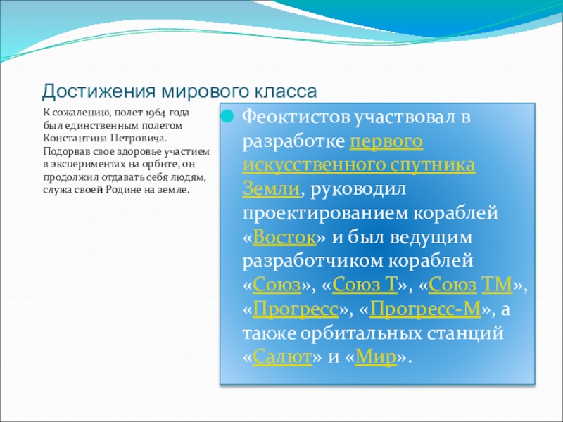Феоктистов участвовал в разработке первого искусственного спутника Земли, руководил проектированием кораблей «Восток» и был ведущим разработчиком кораблей «Союз», «Союз Т», «Союз ТМ», «Прогресс», «Прогресс-М», а также орбитальных станций «Салют» и «Мир».