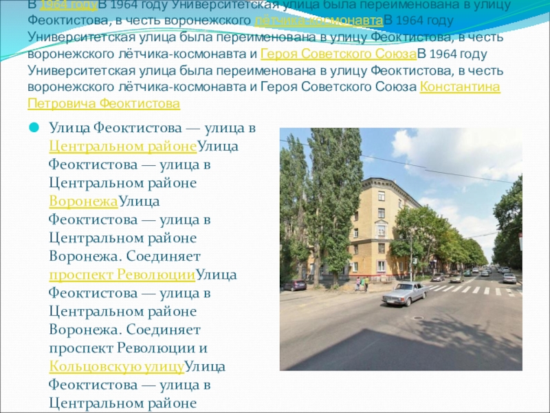 Улица Феоктистова — улица в Центральном районеУлица Феоктистова — улица в Центральном районе ВоронежаУлица Феоктистова — улица в Центральном районе Воронежа. Соединяет проспект РеволюцииУлица Феоктистова — улица в Центральном районе Воронежа. Соединяет проспект Революции и Кольцовскую улицуУлица Феоктистова — улица в Центральном районе Воронежа. Соединяет проспект Революции и Кольцовскую улицу. Пересекает улицы Фридриха ЭнгельсаУлица Феоктистова — улица в Центральном районе Воронежа. Соединяет проспект Революции и Кольцовскую улицу. Пересекает улицы Фридриха Энгельса и СтуденческуюУлица Феоктистова — улица в Центральном районе Воронежа. Соединяет проспект Революции и Кольцовскую улицу. Пересекает улицы Фридриха Энгельса и Студенческую. На кольце, организованном на пересечении улицы Феоктистова с улицей Фридриха Энгельса, примыкает улица Мира.