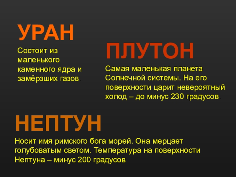 Носит имя римского бога морей. Она мерцает голубоватым светом. Температура на поверхности Нептуна – минус 200 градусов.