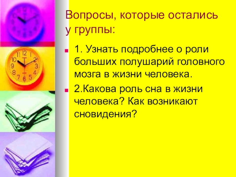 Вопросы, которые остались у группы:1. Узнать подробнее о роли больших полушарий головного мозга в жизни человека.2.Какова роль