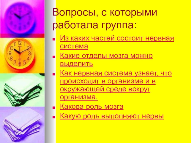 Вопросы, с которыми работала группа:Из каких частей состоит нервная системаКакие отделы мозга можно выделитьКак нервная система узнает, что происходит в организме и в окружающей среде вокруг организма.Какова роль мозгаКакую роль выполняют нервы