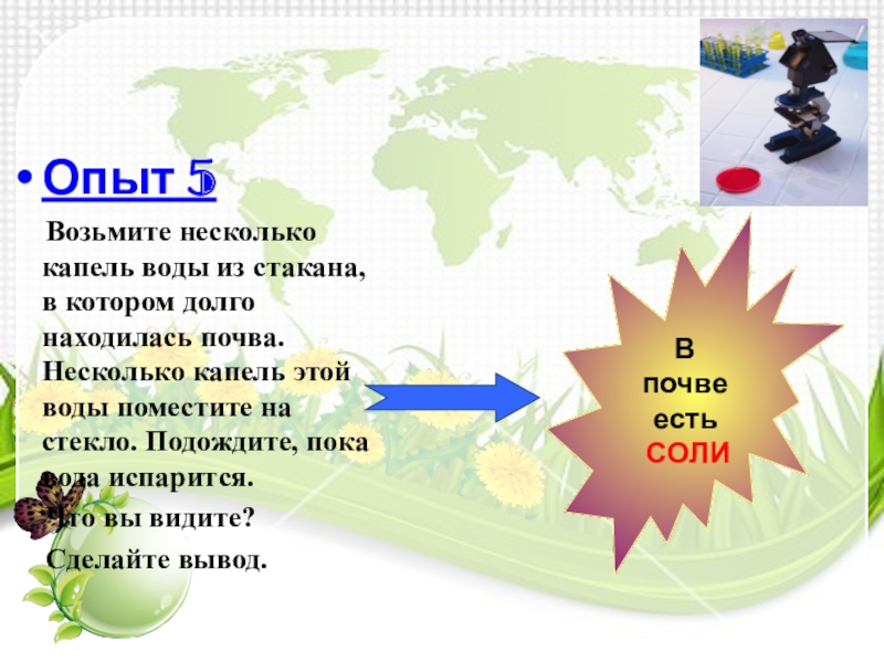 Возьмите промокательную бумагу и насыпьте на нее немного почвы. Прижмите ее плотно к бумаге. Стряхните почву в стакан с водой. Что вы увидите? Что доказывает этот опыт?