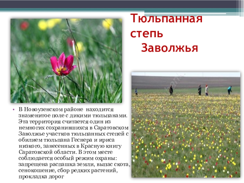 В Новоузенском районе зацвело знаменитое поле с дикими тюльпанами.Эта территория считается один из немногих сохранившихся в Саратовском Заволжье участков тюльпанных степей с обилием тюльпана Геснера и ириса низкого, занесенных в Красную книгу Саратовской области. В этом месте соблюдается особый режим охраны: запрещена распашка территории, выпас скота, сенокошение, сбор редких растений и их частей, прокладка дорог и других коммуникаций, несанкционированная добыча полезных ископаемых