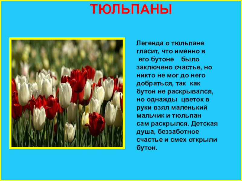 его бутоне было заключено счастье, но никто не мог до него добраться, так как бутон не раскрывался, но однажды цветок в руки взял маленький мальчик и тюльпан сам раскрылся. Детская душа, беззаботное счастье и смех открыли бутон.