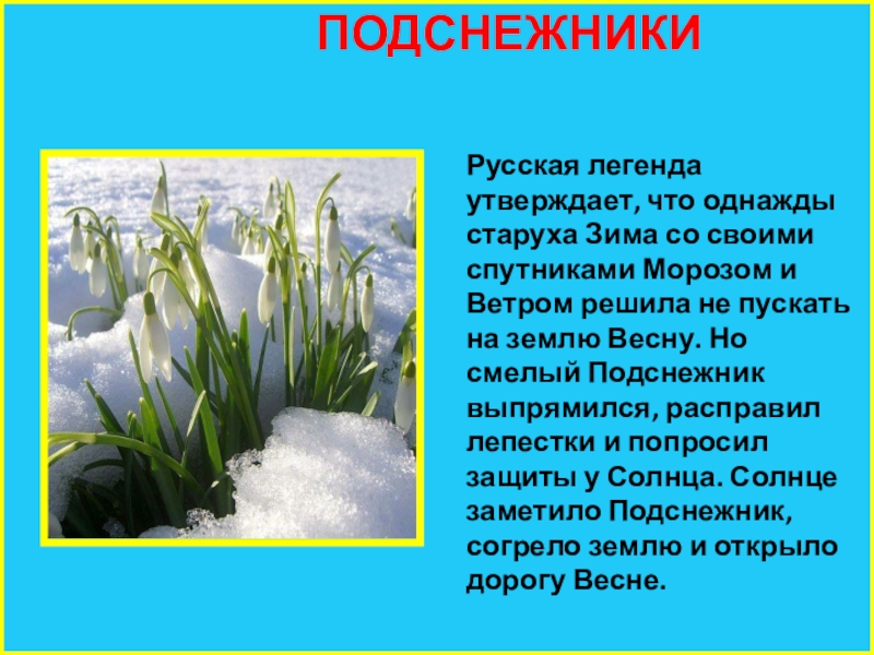 Русская легенда утверждает, что однажды старуха Зима со своими спутниками Морозом и Ветром решила не пускать на землю Весну. Но смелый Подснежник выпрямился, расправил лепестки и попросил защиты у Солнца. Солнце заметило Подснежник, согрело землю и открыло дорогу Весне.