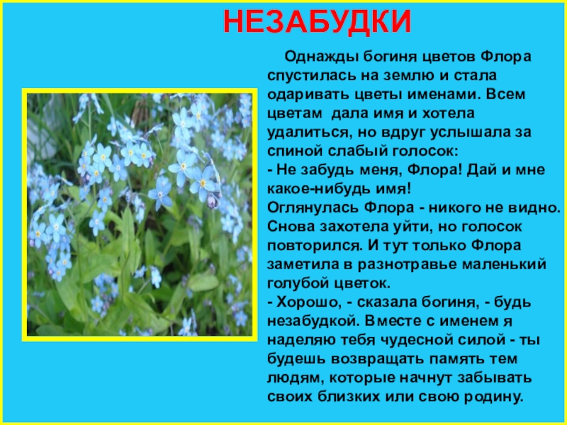 - Хорошо, - сказала богиня, - будь незабудкой. Вместе с именем я наделяю тебя чудесной силой - ты будешь возвращать память тем людям, которые начнут забывать своих близких или свою родину.