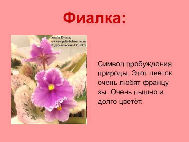Фиалка:Символ пробужденияприроды. Этот цветокочень любят французы. Очень пышно и долго цветёт.
