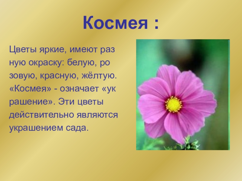 Космея :Цветы яркие, имеют разную окраску: белую, розовую, красную, жёлтую.«Космея» - означает «украшение». Эти цветы действительно являютсяукрашением