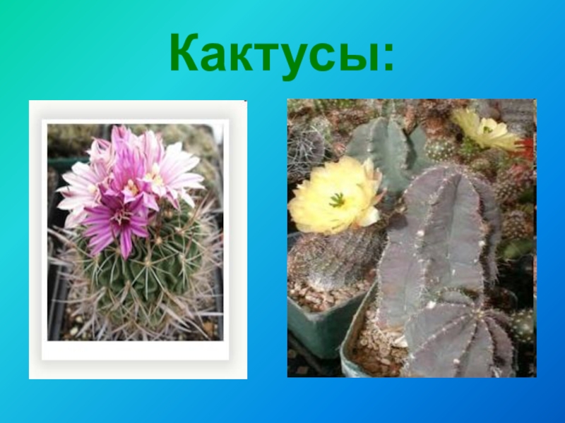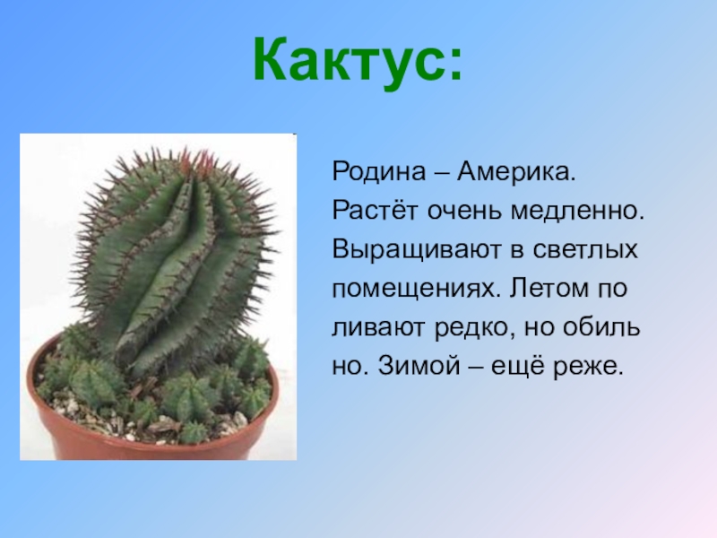 Кактус:Родина – Америка.Растёт очень медленно.Выращивают в светлыхпомещениях. Летом поливают редко, но обильно. Зимой – ещё реже.