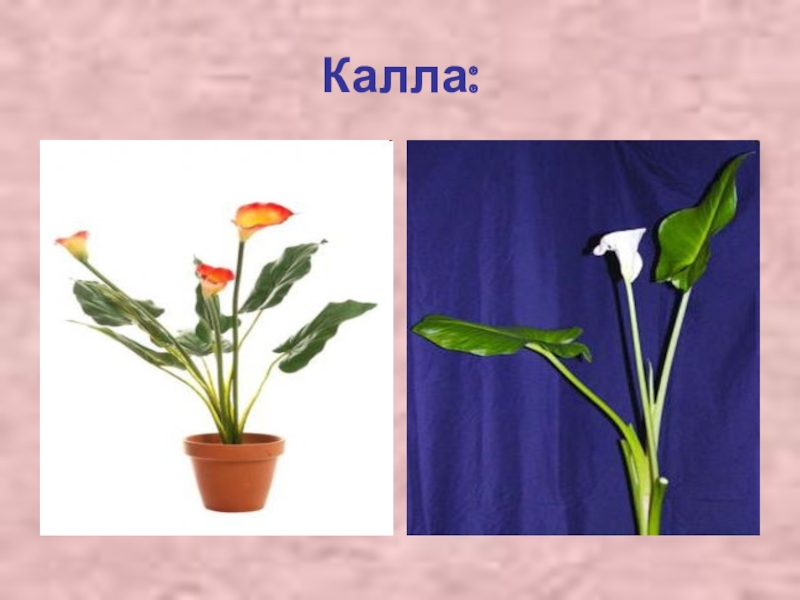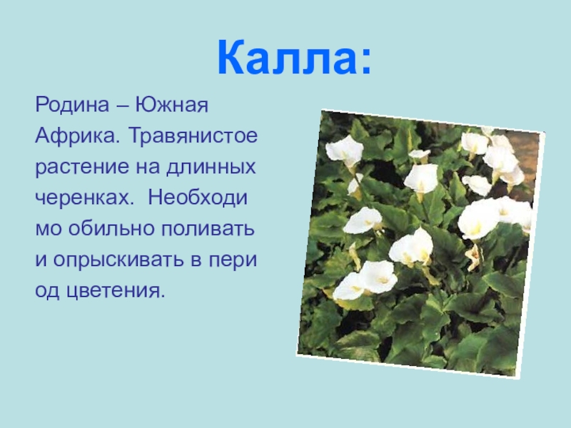 Калла:Родина – Южная Африка. Травянистоерастение на длинныхчеренках. Необходимо обильно поливать и опрыскивать в период цветения.