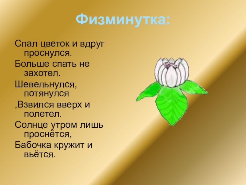Физминутка:Спал цветок и вдруг проснулся.Больше спать не захотел.Шевельнулся, потянулся,Взвился вверх и полетел.Солнце утром лишь проснётся,Бабочка кружит и