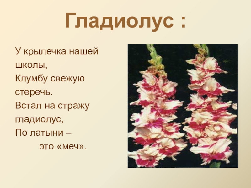 Гладиолус :У крылечка нашейшколы,Клумбу свежуюстеречь.Встал на стражугладиолус,По латыни –     это «меч».