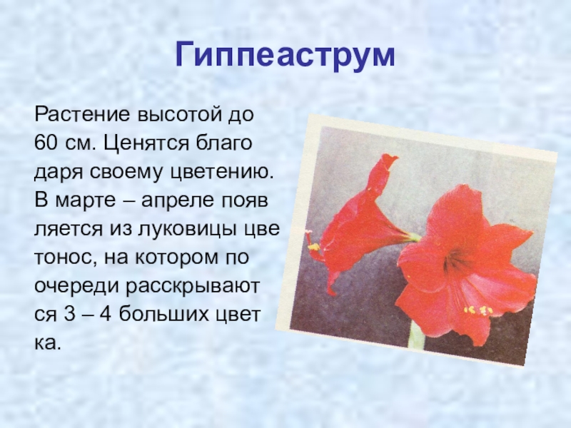 ГиппеаструмРастение высотой до 60 см. Ценятся благодаря своему цветению.В марте – апреле появляется из луковицы цветонос, на