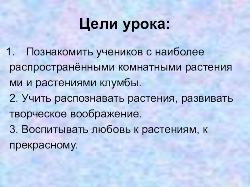Цели урока:Познакомить учеников с наиболее распространёнными комнатными растениями и растениями клумбы.2. Учить распознавать растения, развиватьтворческое воображение.3. Воспитывать