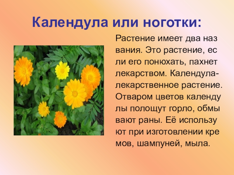 Календула или ноготки:Растение имеет два названия. Это растение, если его понюхать, пахнетлекарством. Календула-лекарственное растение.Отваром цветов календулы полощут