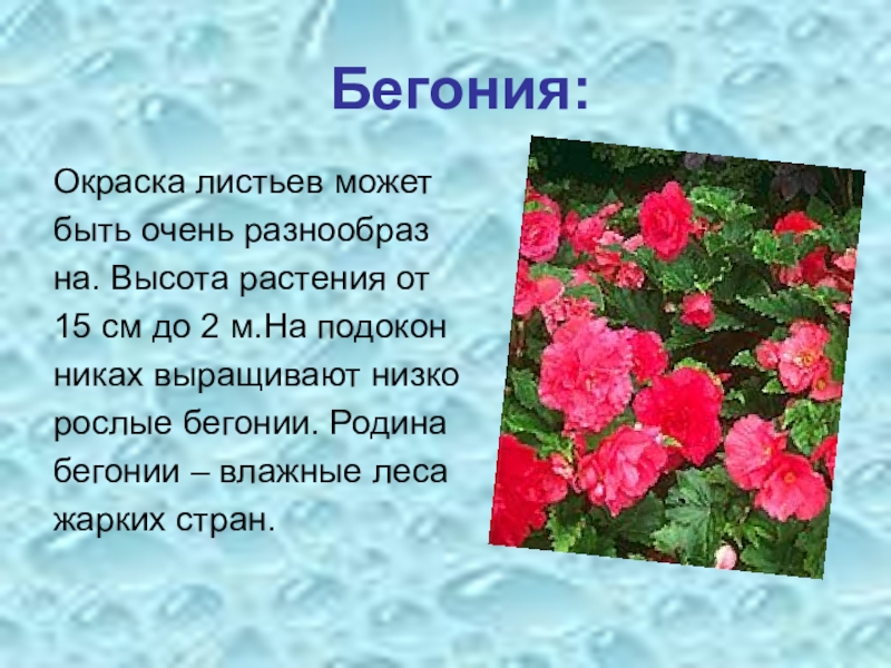 Бегония:Окраска листьев можетбыть очень разнообразна. Высота растения от15 см до 2 м.На подоконниках выращивают низкорослые бегонии. Родинабегонии