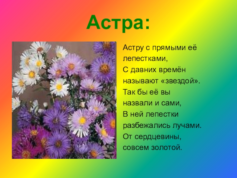 Астра:Астру с прямыми еёлепестками,С давних времённазывают «звездой».Так бы её вы назвали и сами,В ней лепесткиразбежались лучами.От сердцевины,совсем