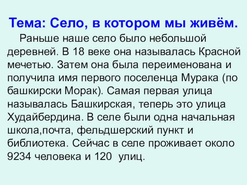 Тема: Село, в котором мы живём. Раньше наше село было небольшой деревней. В 18 веке она называлась Красной мечетью. Затем она была переименована и получила имя первого поселенца Мурака (по башкирски Морак). Самая первая улица называлась Башкирская,