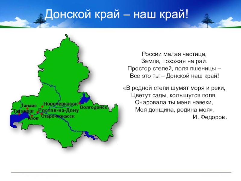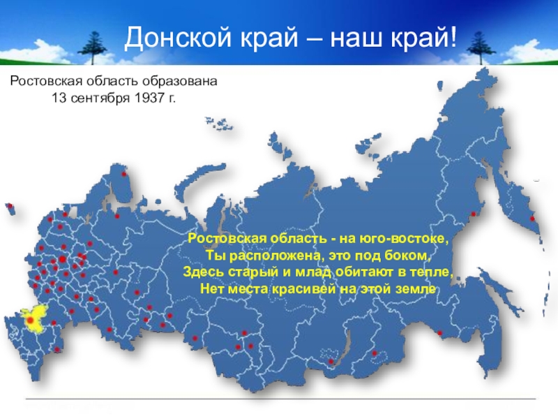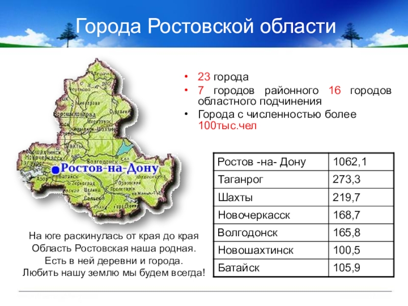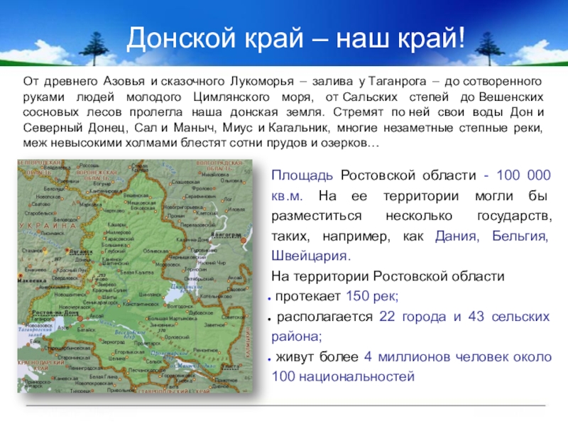 Площадь Ростовской области - 100 000 кв.м. На ее территории могли бы разместиться несколько государств, таких, например, как Дания, Бельгия, Швейцария.