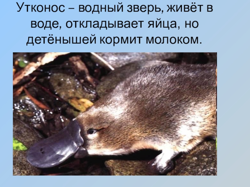 Слайд 17Утконос – водный зверь, живёт в воде, откладывает яйца, но детёнышей