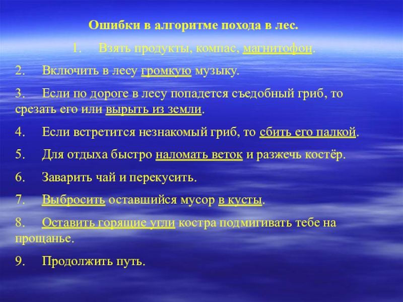 Ошибки в алгоритме похода в лес.1.     Взять продукты, компас, магнитофон.2.     Включить в лесу громкую музыку.3.     Если по