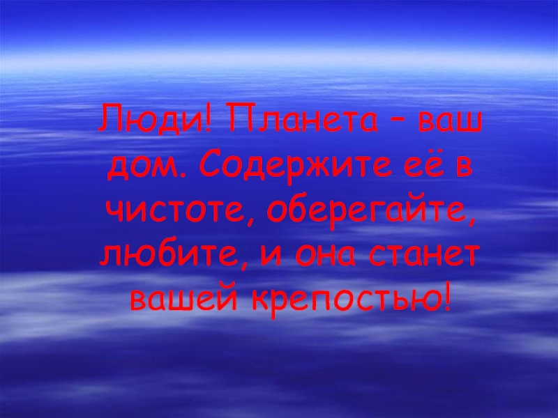Люди! Планета – ваш дом. Содержите её в чистоте, оберегайте, любите, и она станет вашей крепостью!