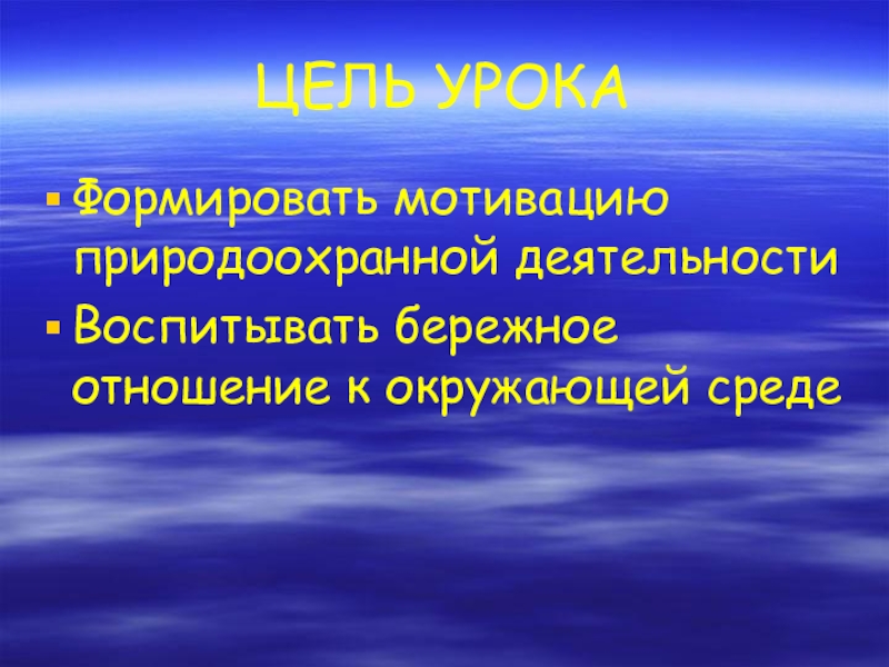 ЦЕЛЬ УРОКАФормировать мотивацию природоохранной деятельностиВоспитывать бережное отношение к окружающей среде