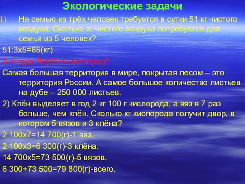 Экологические задачиНа семью из трёх человек требуется в сутки 51 кг чистого воздуха. Сколько кг чистого воздуха