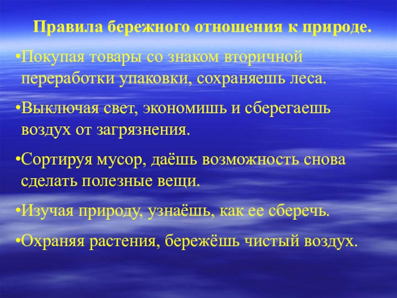 Правила бережного отношения к природе.Покупая товары со знаком вторичной переработки упаковки, сохраняешь леса.Выключая свет, экономишь и сберегаешь