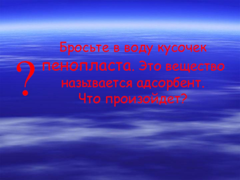 Бросьте в воду кусочек пенопласта. Это вещество называется адсорбент.  Что произойдет??