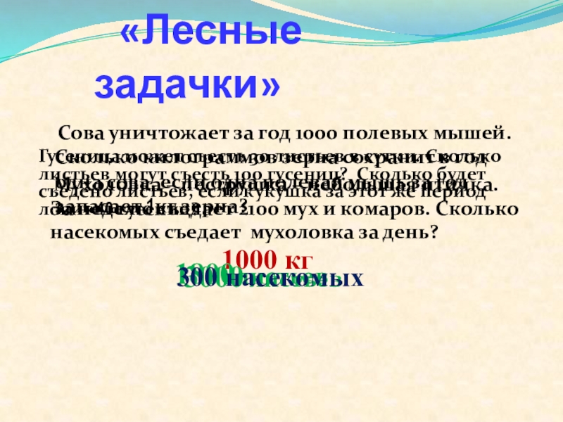 Гусеница может съесть 30 листьев в сутки. Сколько листьев могут съесть 100 гусениц? Сколько будет съедено листьев, если кукушка за этот же период ловит 40 гусениц?