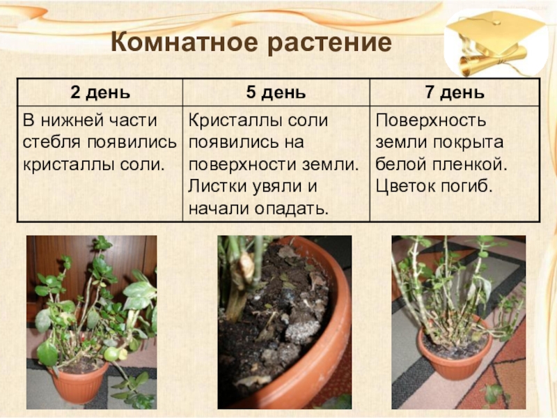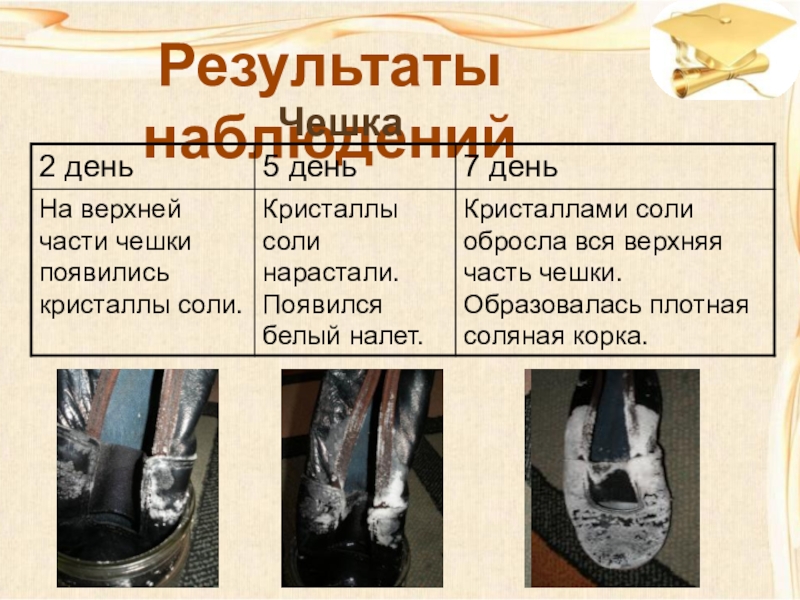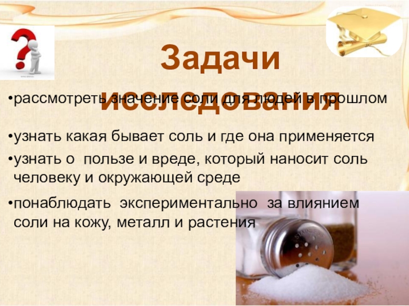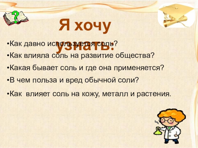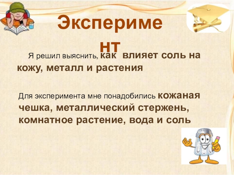 понаблюдать экспериментально за влиянием соли на кожу, металл и растения