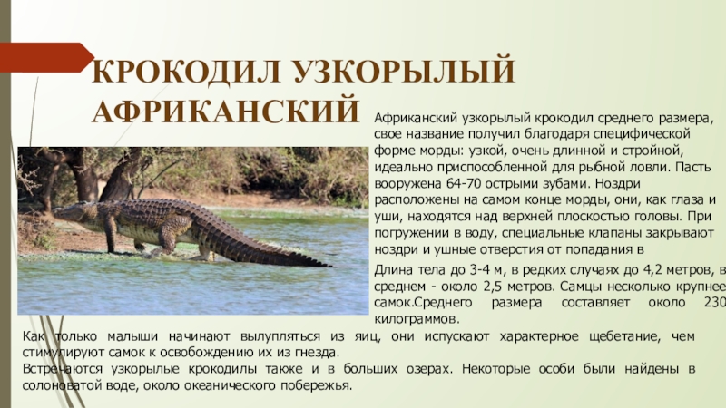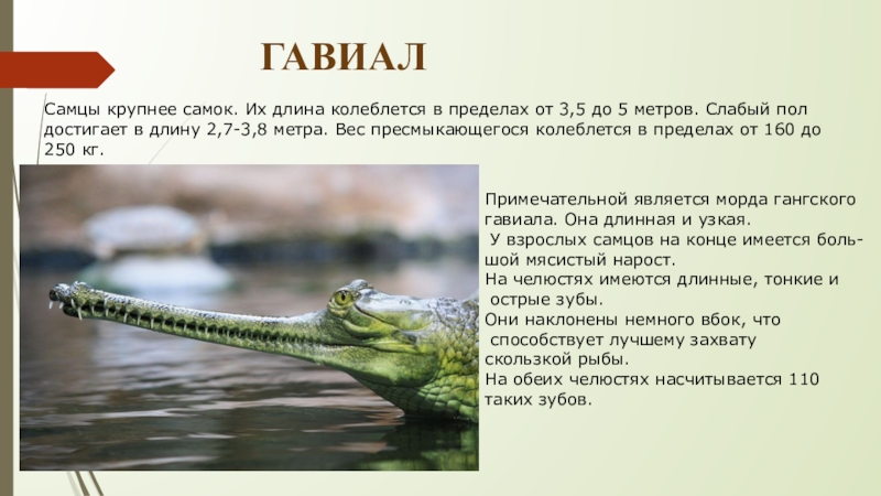 Примечательной является морда гангского гавиала. Она длинная и узкая.