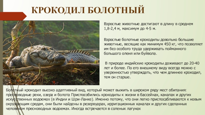 Болотный крокодил высоко адаптивный вид, который может выжить в широком ряду мест обитания: пресноводные реки, озера и болота Приспособились крокодилы к жизни в бассейнах, каналах и других искусственных водоемах (в Индии и Шри-Ланке). Именно потому, что они легко приспосабливаются к новым окружающим средам, они были найдены в резервуарах, ирригационных каналах и других сделанных человеком пресноводных водоемах. Иногда встречается в соленых лагунах