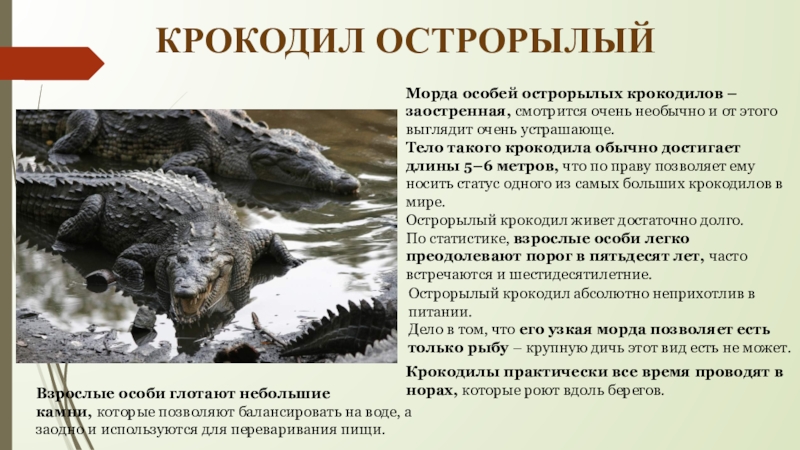 Острорылый крокодил абсолютно неприхотлив в питании.