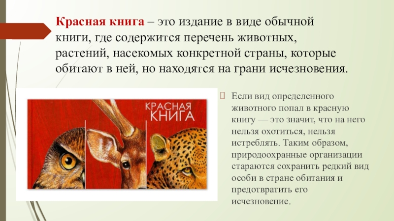 Красная книга – это издание в виде обычной книги, где содержится перечень животных, растений, насекомых конкретной страны, которые обитают в ней, но находятся на грани исчезновения.