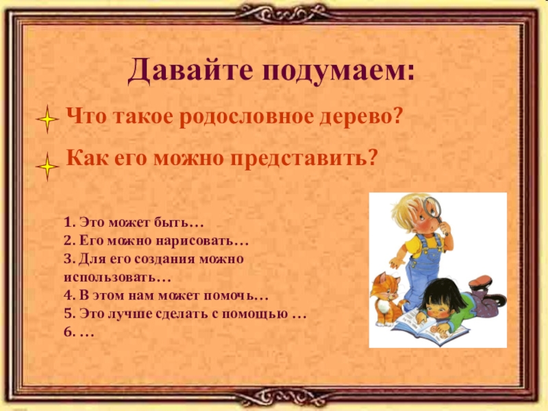 Давайте подумаем: Что такое родословное дерево? Как его можно представить? 1. Это может быть…2. Его можно нарисовать…3.