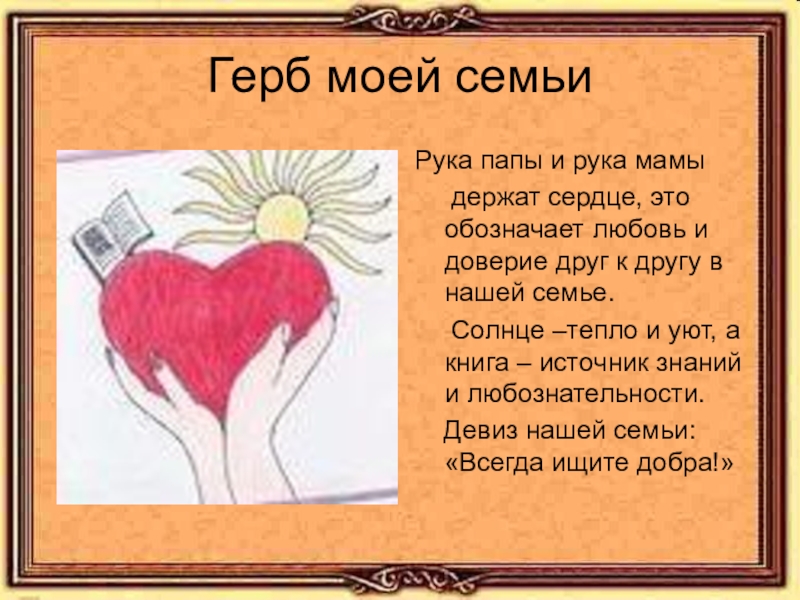 Герб моей семьиРука папы и рука мамы   держат сердце, это обозначает любовь и доверие друг