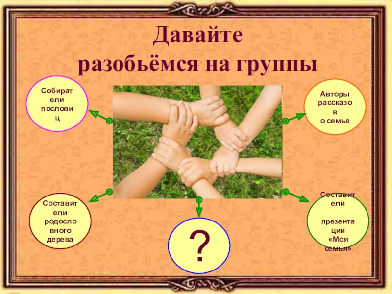 Давайте разобьёмся на группыСоставители родословногодереваСобиратели пословицАвторырассказово семьеСоставители презентации«Моя семья» ?
