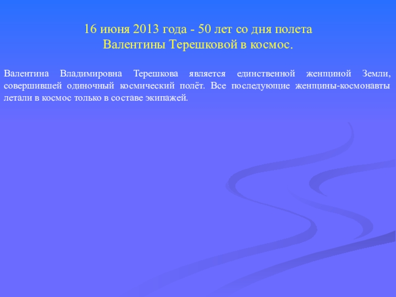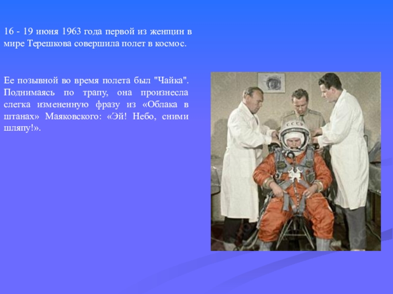Ее позывной во время полета был "Чайка". Поднимаясь по трапу, она произнесла слегка измененную фразу из «Облака в штанах» Маяковского: «Эй! Небо, сними шляпу!».