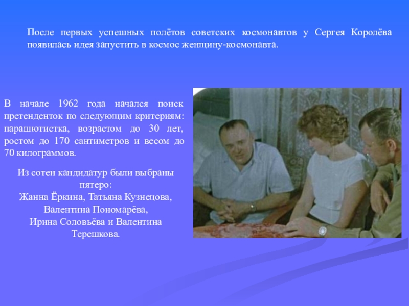 В начале 1962 года начался поиск претенденток по следующим критериям: парашютистка, возрастом до 30 лет, ростом до 170 сантиметров и весом до 70 килограммов.